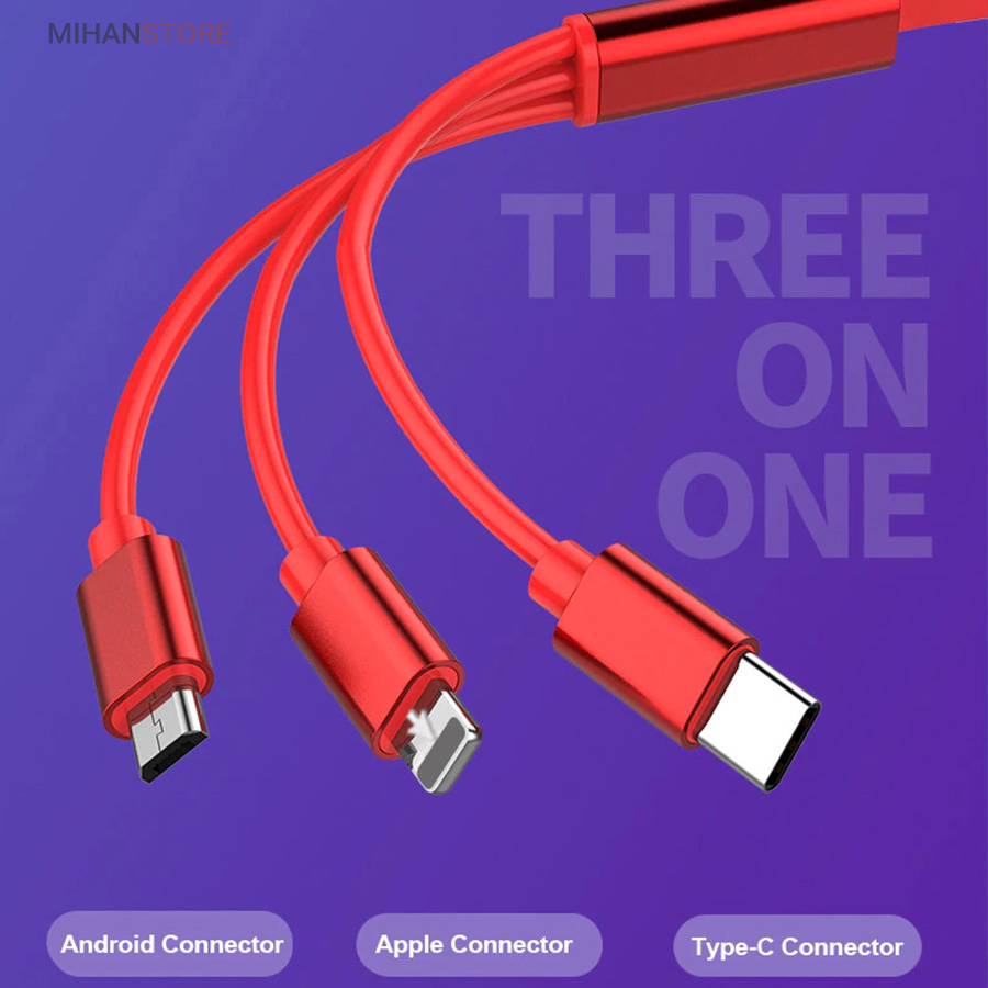کابل فست شارژ USB جمع شو 3in1 توان 3.0 آمپر با طول 1 متر دارای هر سه پورت شارژ لایتنینگ (آِیفون)، میکرو یو اس بی(اندروید) و تایپ سی هست که شما برای شارژ هر دستگاهی که دارای یکی از این پورت ها می باشد، باید کابل مخصوص آن را متصل نمایید. این کالا یک انتخاب هوشمندانه و عالی است، چرا که این کابل یک محصول با کیفیت و دارای امکانات ویژه ای است که مهمترین ویژگی آن 3 سر بودن آن است و دیگر ویژگی متمایز آن جمع شو بودن آن و طبیعتا قابلیت آسان حمل آن می باشد. اگر دارای چند دستگاه الکترونیکی مختلف باشید قطعا با این مشکل هم مواجه‌اید که هر کدام کابل خودشان را لازم دارند و هر روز باید با چندین کابل در هم پیچیده درگیر باشید. با کمک این محصول میتوانید همزمان گوشی و پاوربانک و هندزفری خود را شارژ کنید و برای شارژ کردن وسایل خود بدنبال پریزهای برق در هر گوشه محل مورد نیاز نگردید. این کابل در انتقال جریان به گوشی عالی عمل کرده و با سرعت بالایی گوشی را شارژ مینماید زیرا در ساخت آن از از بهترين فلزات استفاده شده است.